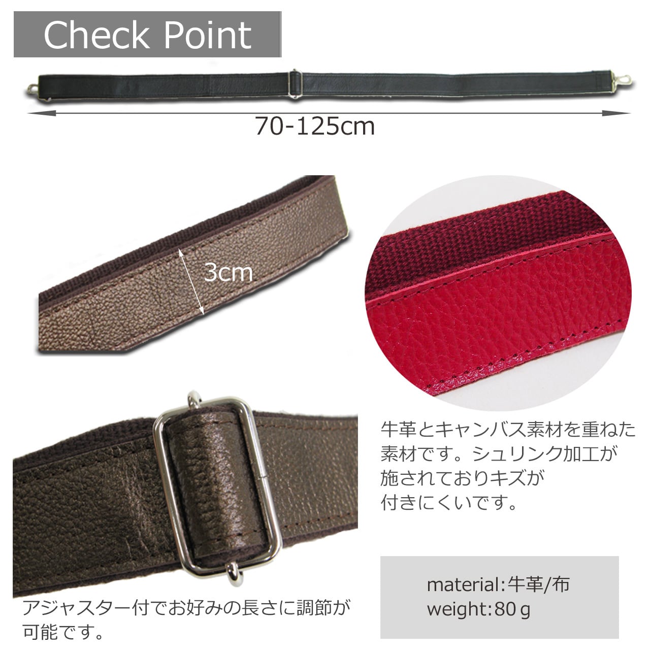 日本製の丁寧な作りです。幅は30mmで一般的な太めショルダーとして、