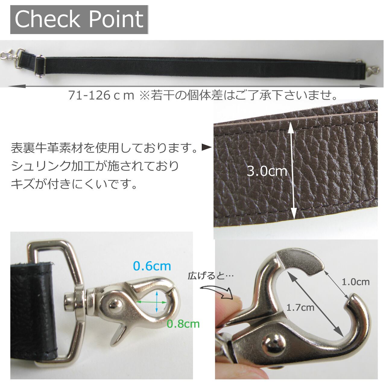少し大きめのバッグにも 合わせやすい幅です。長さはお好みで調節可能(71-126cm)です。 シュリンク加工が施されたキズ付きにくく目立ちにくい質感なので気兼ねなく使えます。