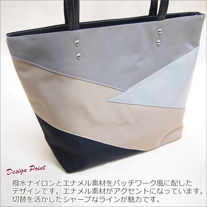 撥水ナイロンとエナメル素材の組み合わせがお洒落で、
