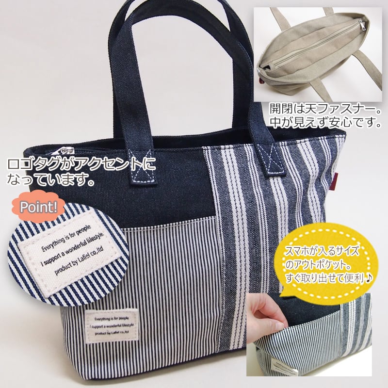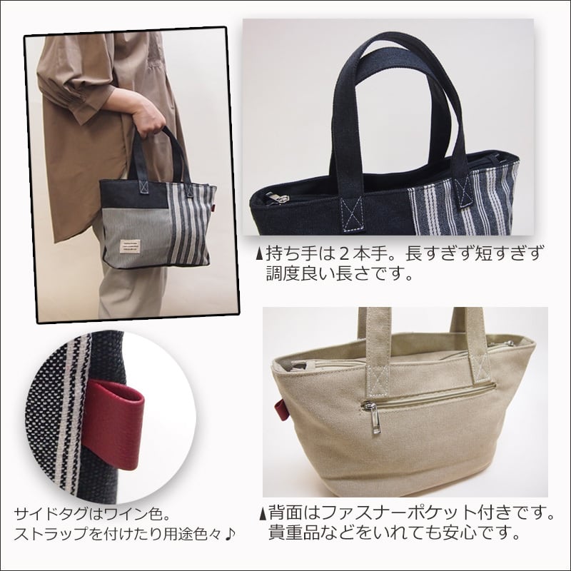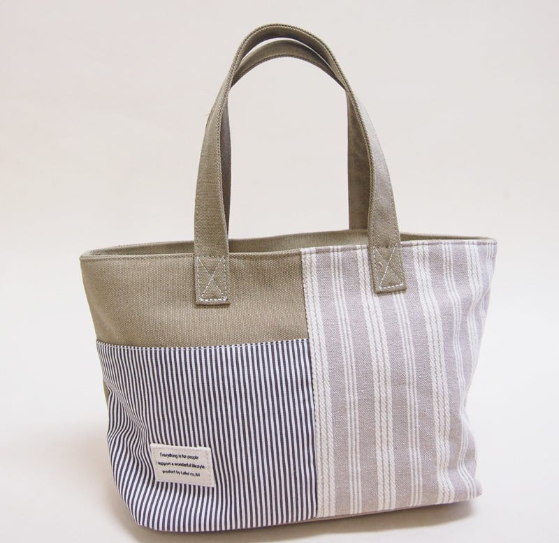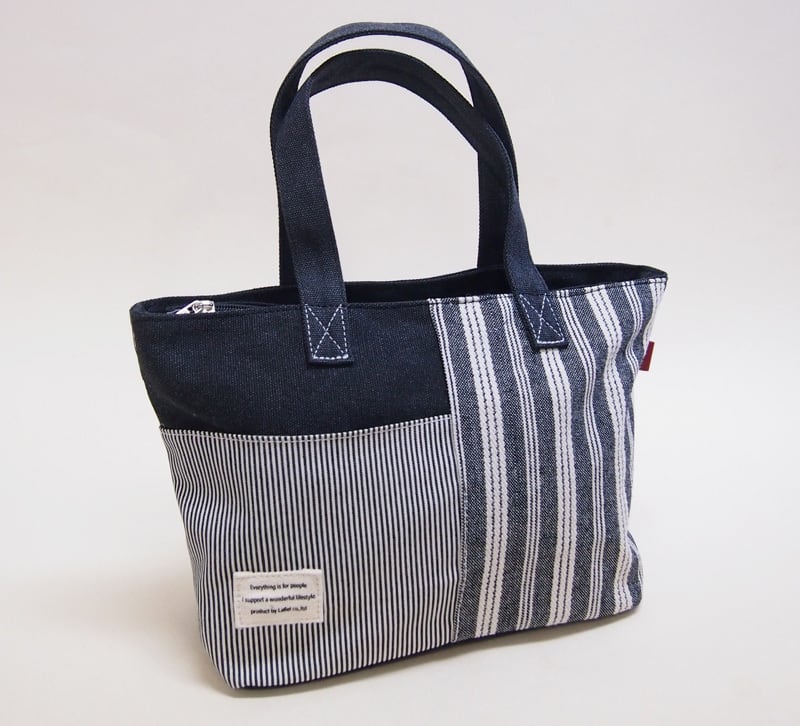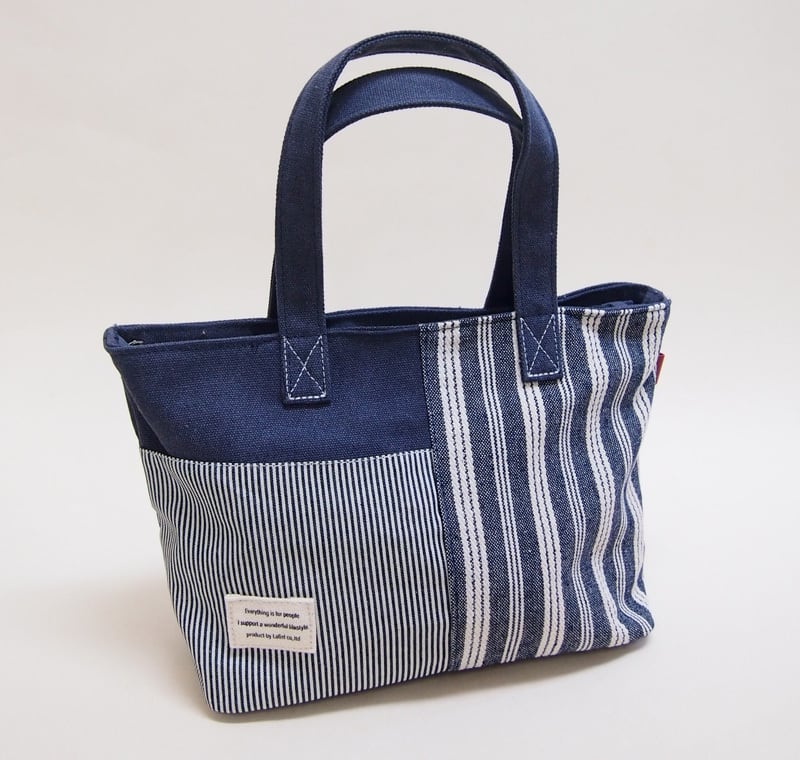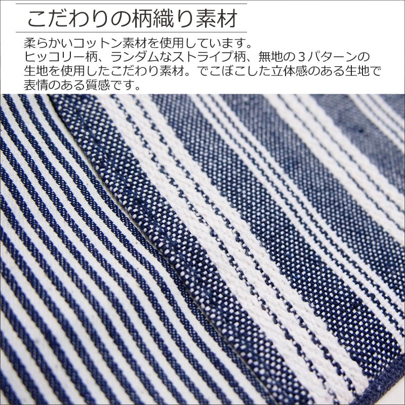 ストライプやヒッコリー、無地の3パターンの生地を使用したデザインです。