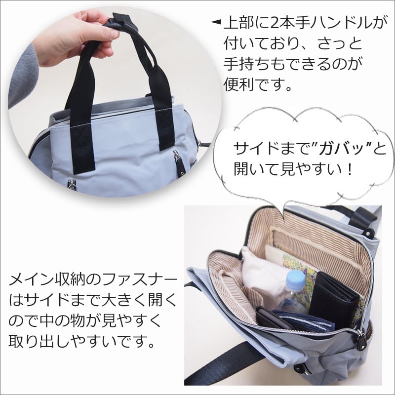 持ち手がショルダーとハンドルが付いており、背負わない時にさっと持てるデザインです。アジャスター付きのショルダーでお好みの長さで背負えます。