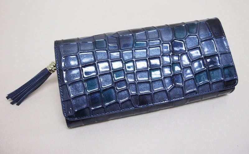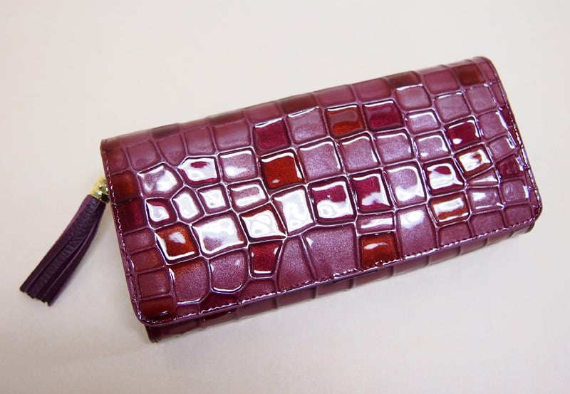 comments:こちらはクロコ型押しを施した牛革エナメル素材の長財布です。