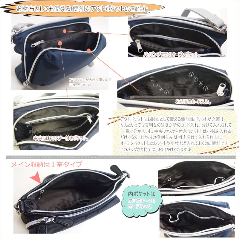 カード入れや、仕切りを兼ねたファスナーポケットなどお財布としても使えるアウトポケットが便利です。