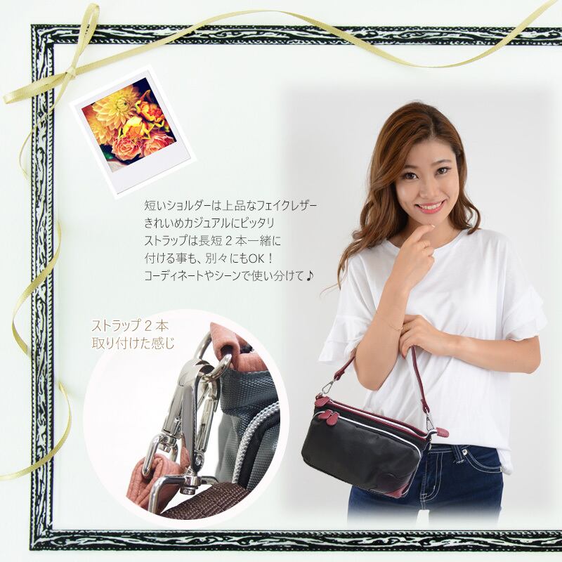 長短のショルダーストラップ2本付きでシーンに合わせた使い方のできる機能的なバッグです。