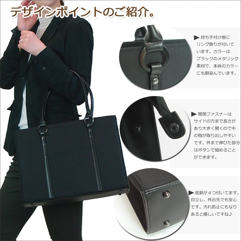 持ち手のリング飾りは本体に馴染んだブラックのメタリック素材で、落ち着いた印象です。